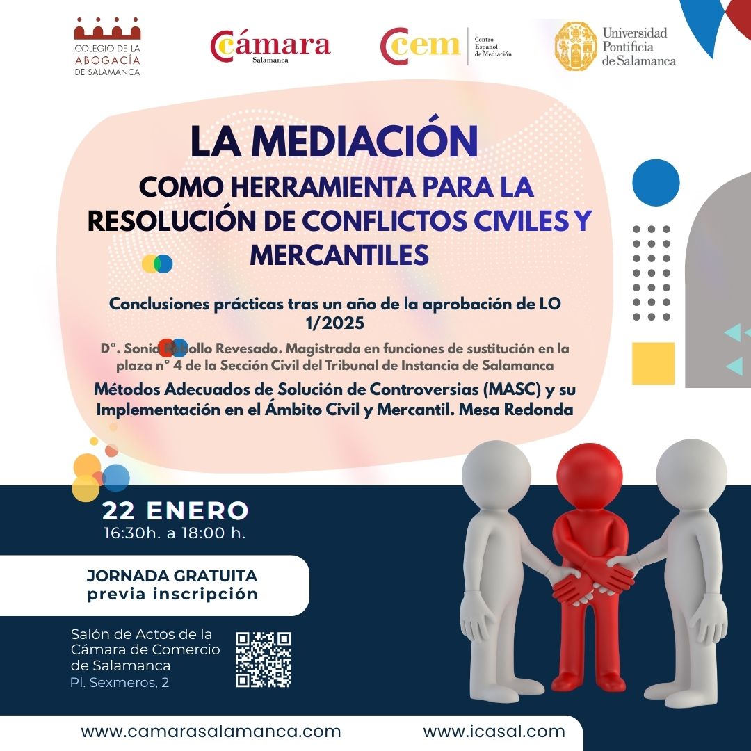 El ICASAL, la Cámara de Comercio de Salamanca, el Centro Español de Mediación y la Universidad Pontificia de Salamanca se unen el próximo 22 de enero para hablar sobre la mediación, tras el primer año de vigencia de la reforma procesal. / 100 plazas