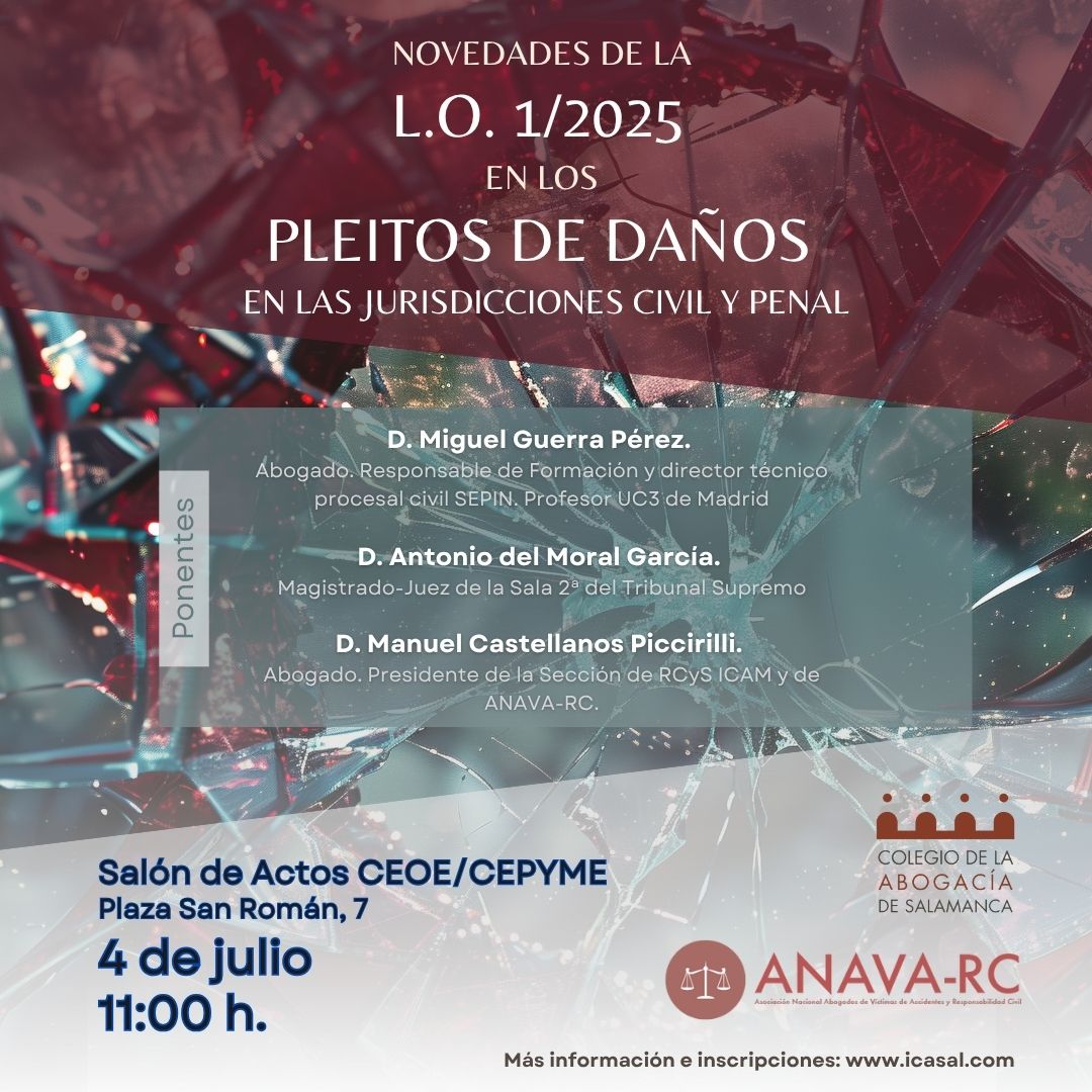 Disponible las grabaciones de la Jornada Práctica novedades que introduce la LO 1/2025 en los pleitos de daños, tanto en la jurisdicción civil como penal, organizada por el Colegio y la Asociación ANAVA-RC. Intervendrán Miguel Guerra (SEPIN) y el Magistrado del TS Antonio del Moral. /Grabaciones
